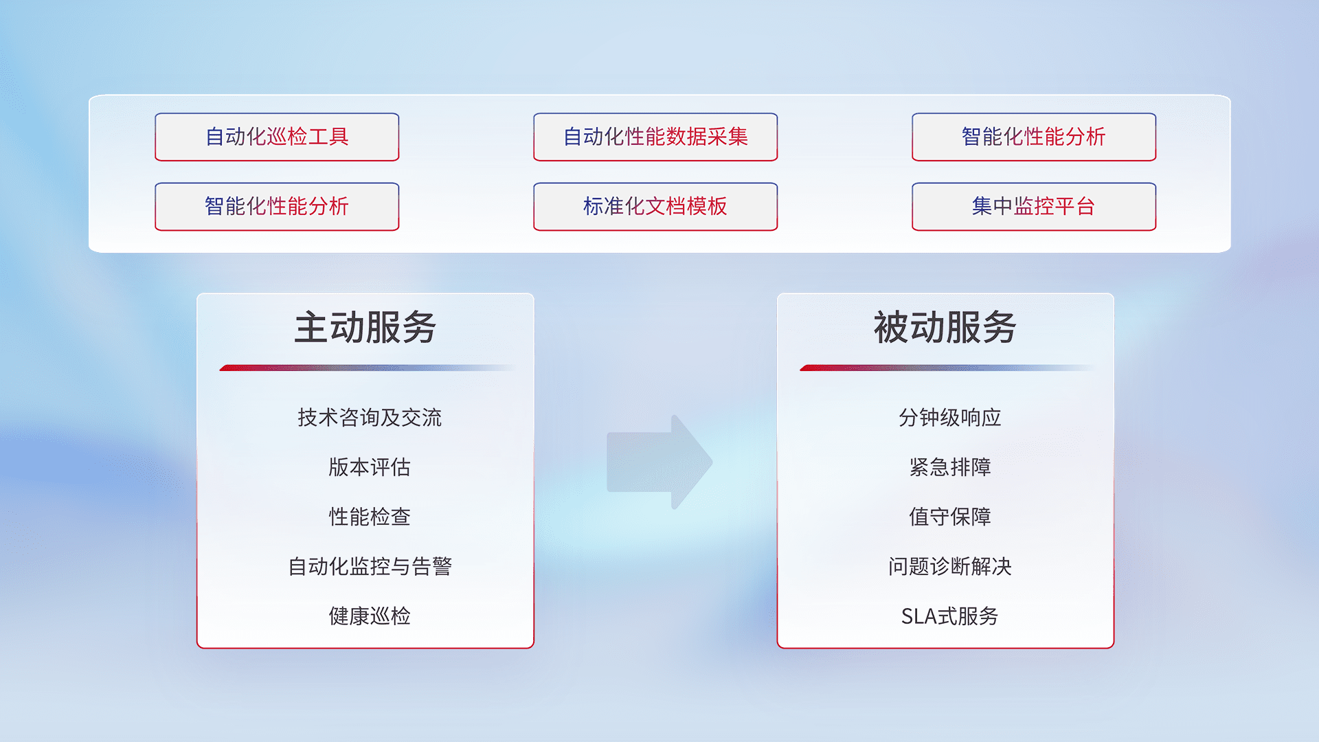 智能化工具和标准化文档,,,,保障服务质量,,提供主动服务(包含技术咨询、、版本评估、、性能检查、、、自动化监控与告警、、、、健康巡检)和被动服务包含(分钟级响应、、、紧急排障、、、值守保障、、、问题诊断解决、、SLA服务)。。。